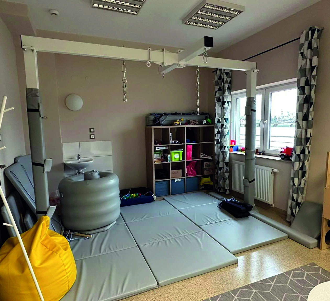 • Sala wyposażona zgodnie ze standardami SI, zapewniająca bezpieczną przestrzeń do stymulacji i wyciszenia układów zmysłowych.